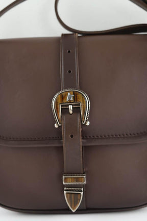 Sac à bandoulière de seconde main Golden Goose RODEO MOYEN marron. Matière principale cuir. Longueur : 26cm. Largeur : 24cm. Hauteur : 8cm. Longueur bandoulière : 108cm. Avec Pochon. Collection Femme. Jamais Porté. Référence : 042010112.