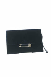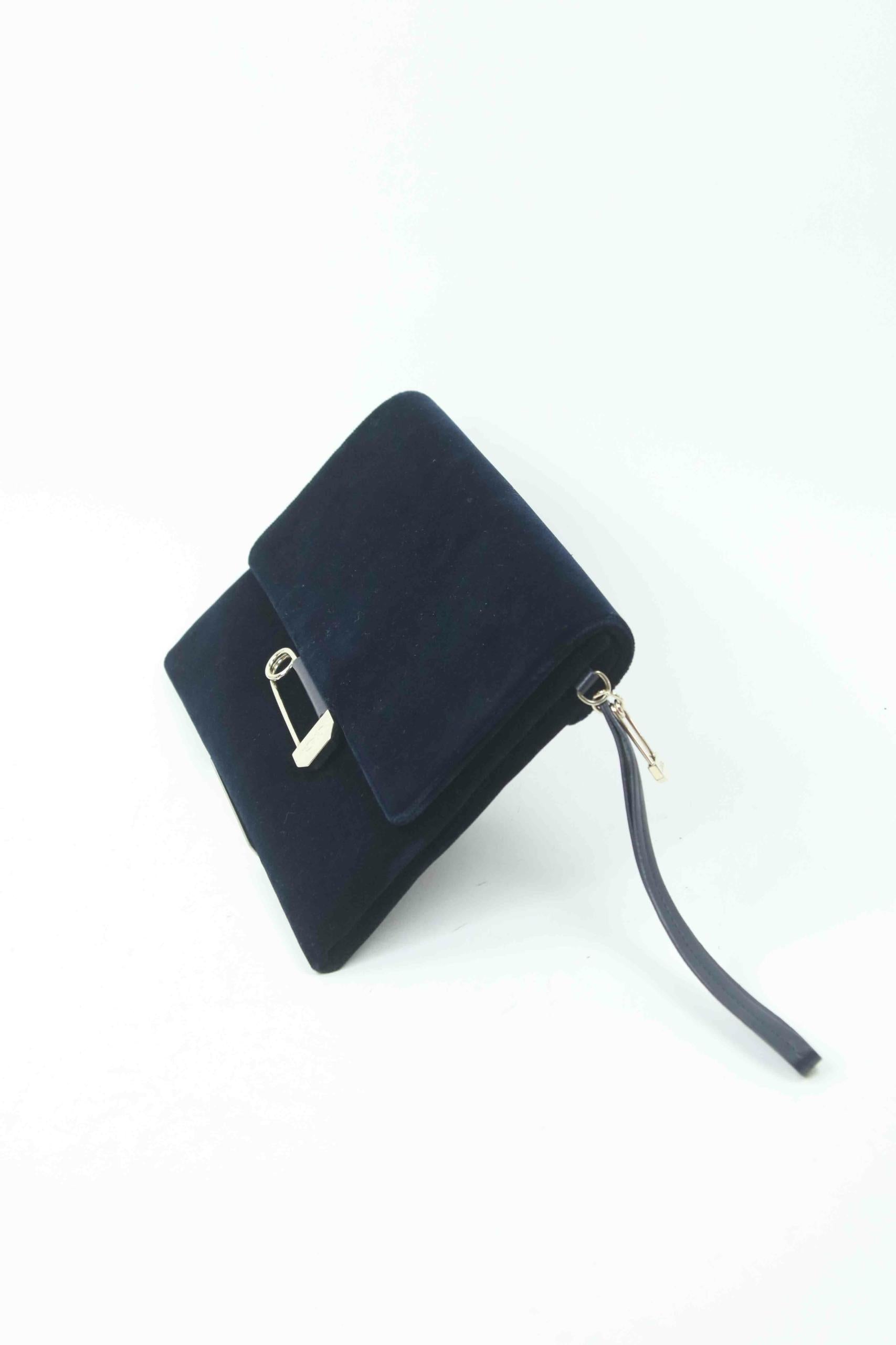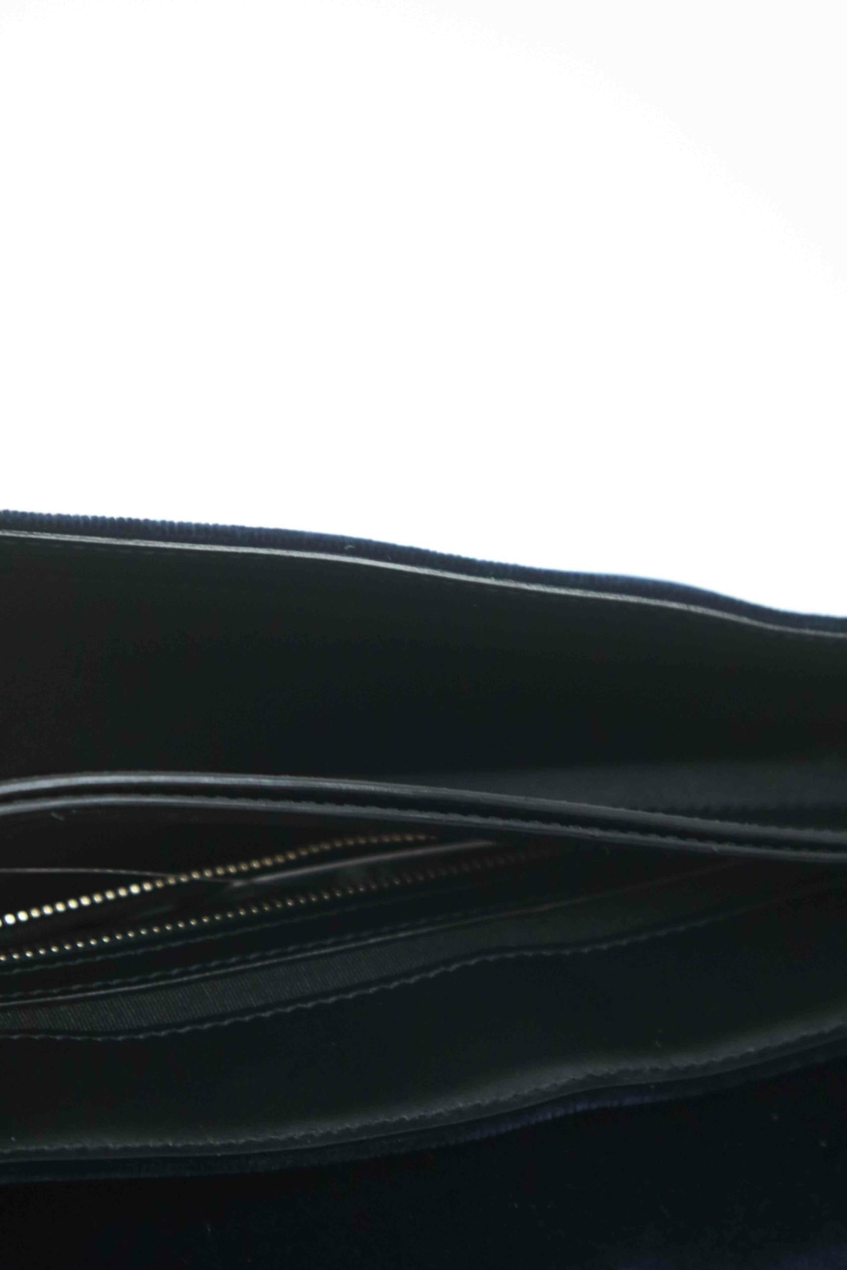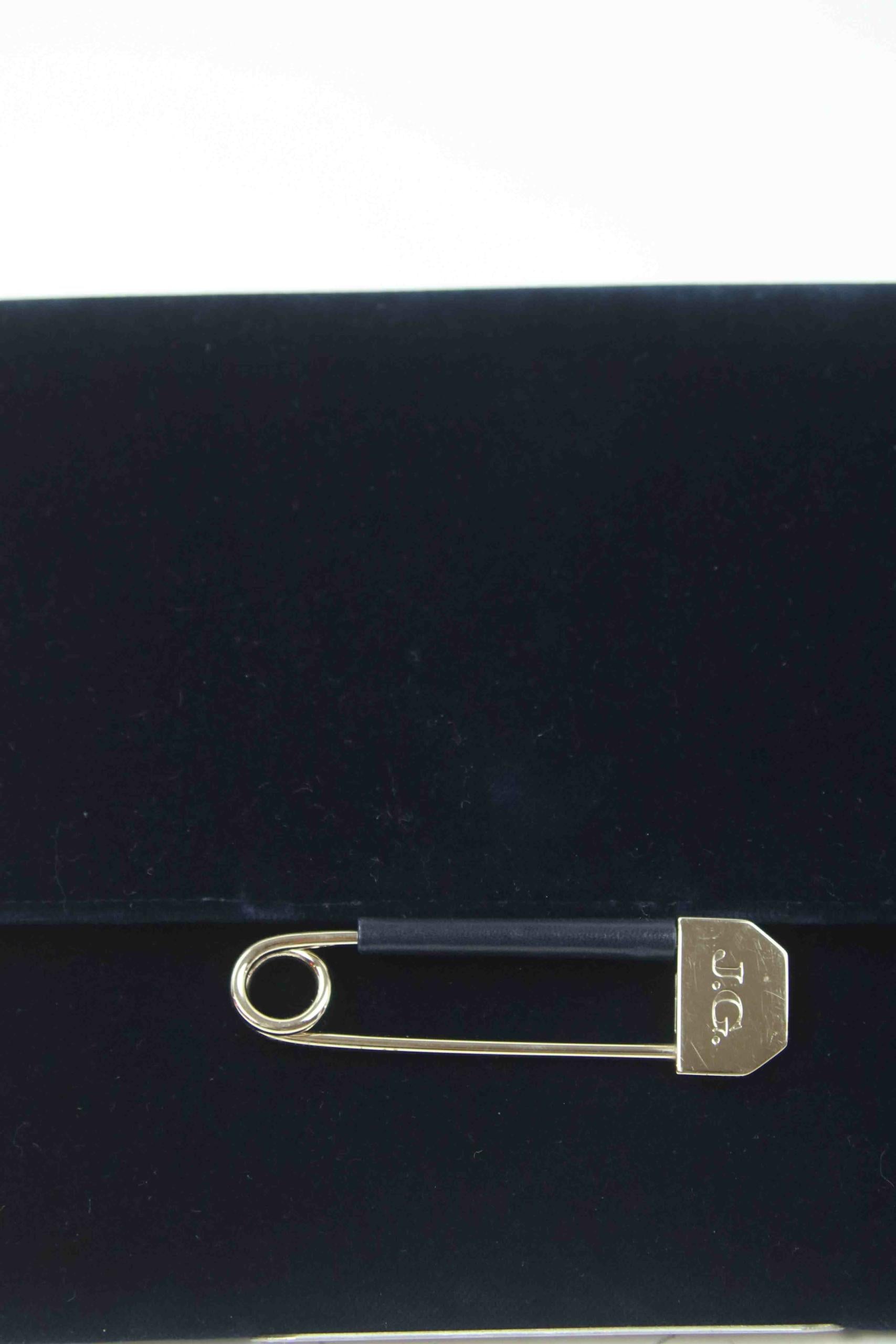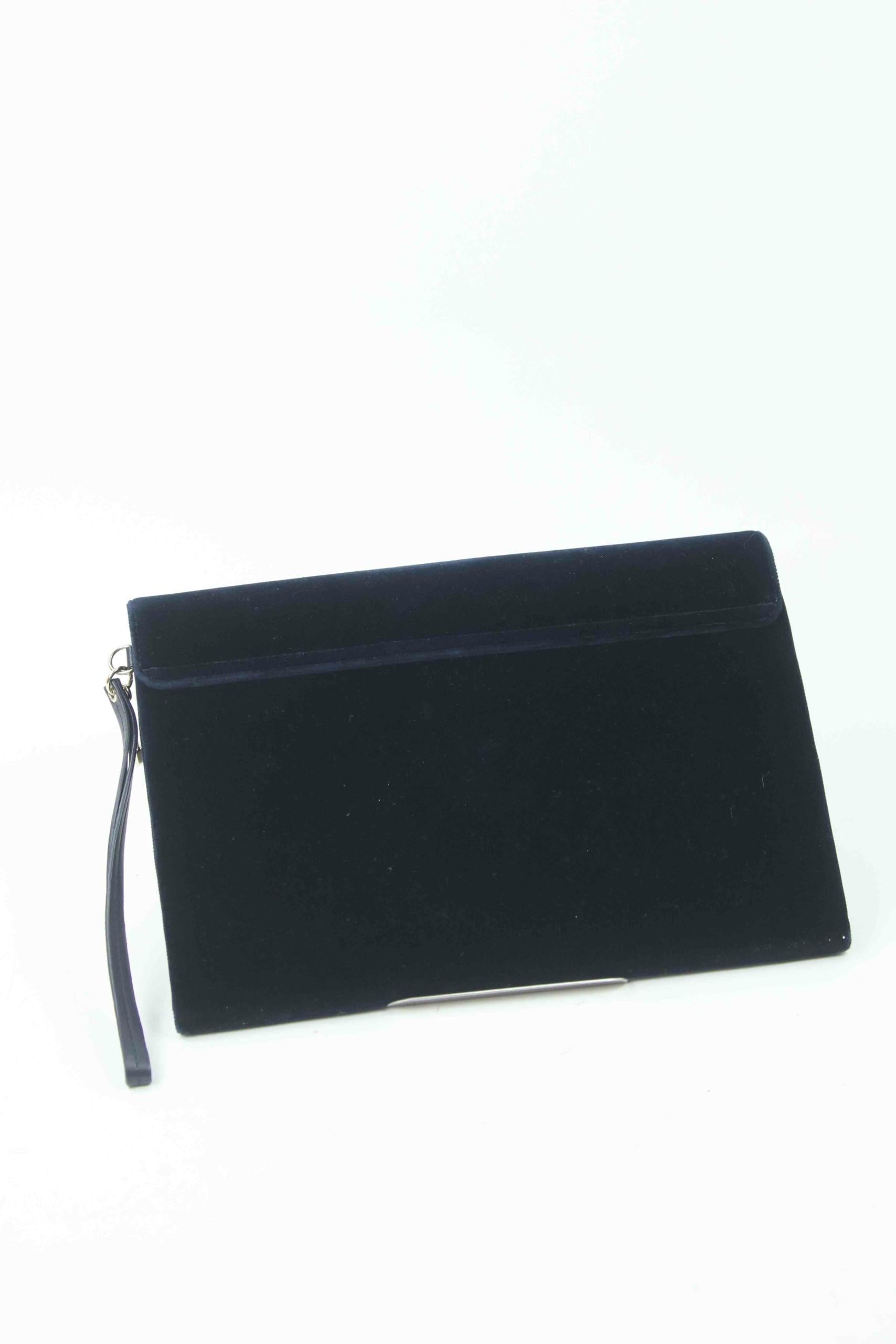 Pochette de seconde main John Galliano bleu velours. Largeur : 28cm. Profondeur : 18cm. Hauteur : 19cm. Collection Femme. Très Bon État. Pochette avec épingle à nourrice - 3 poches - Lanière. Référence : 926009.