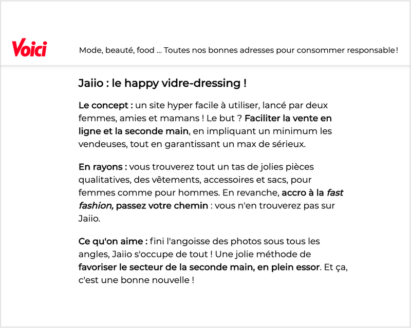"Envie de vider vos placards sans effort ? Avec jaiio, c’est super simple ! Ce dépôt-vente en ligne s’occupe de tout : photos, descriptifs, réponses aux questions des acheteurs, envois … Et vous recevez la moitié du montant de la vente de votre article."