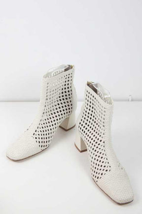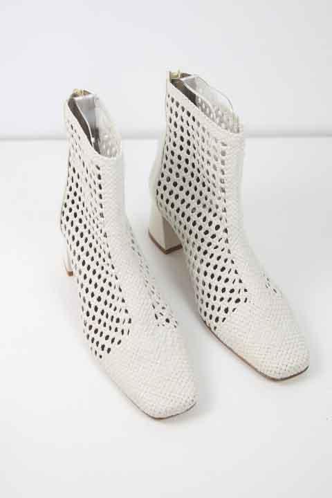 Boots ouvertes de seconde main Souliers Martinez blanc 100% cuir. Taille 40. Hauteur talons : 6cm. Tige : 14cm. Collection Femme. Très Bon État. Modèle "Nova Ibiza" - Couleur "Salinas Woven Leather". Référence : 1389047.