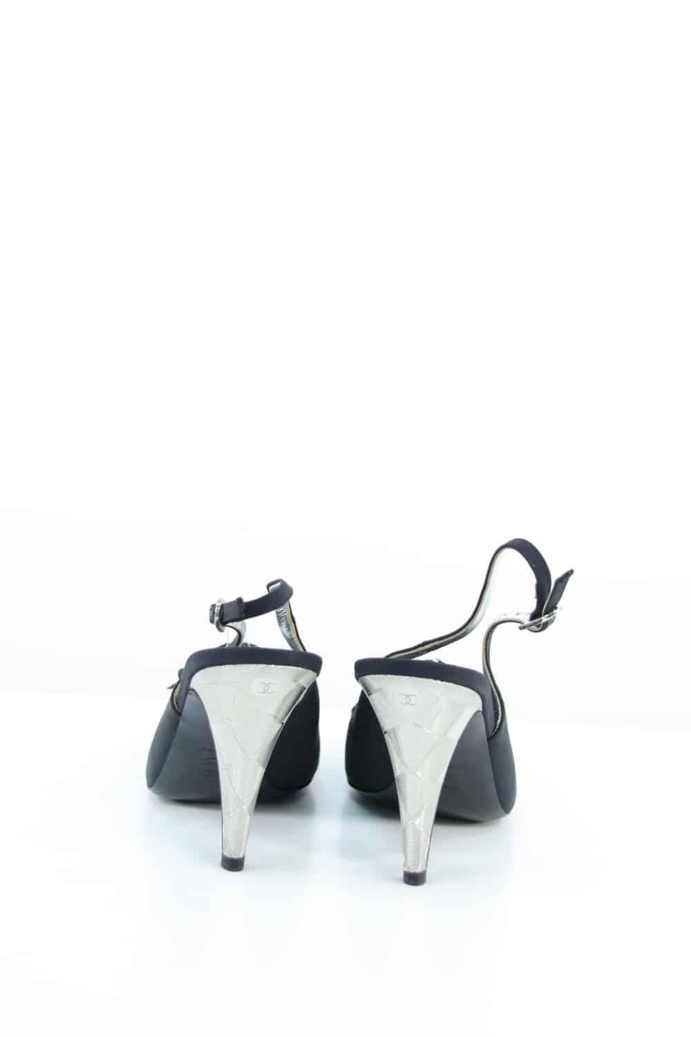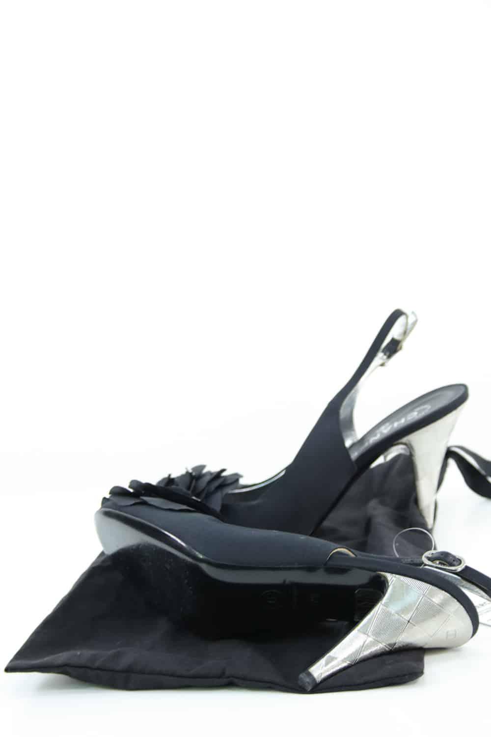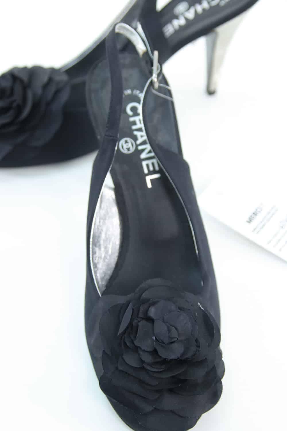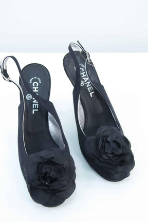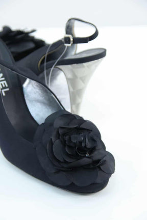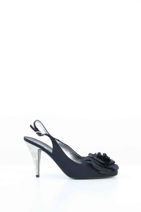 Escarpins avec fleurs à l'avant dans son pochon - Talon métallique - Talon 10cm de seconde main Chanel noir toile. Taille 38. Collection Femme. Très Bon État. Référence : 627034.
