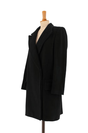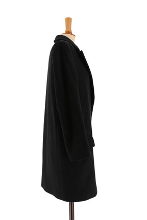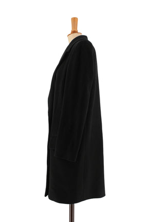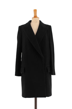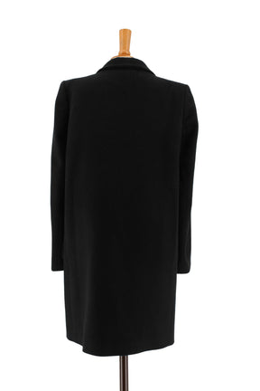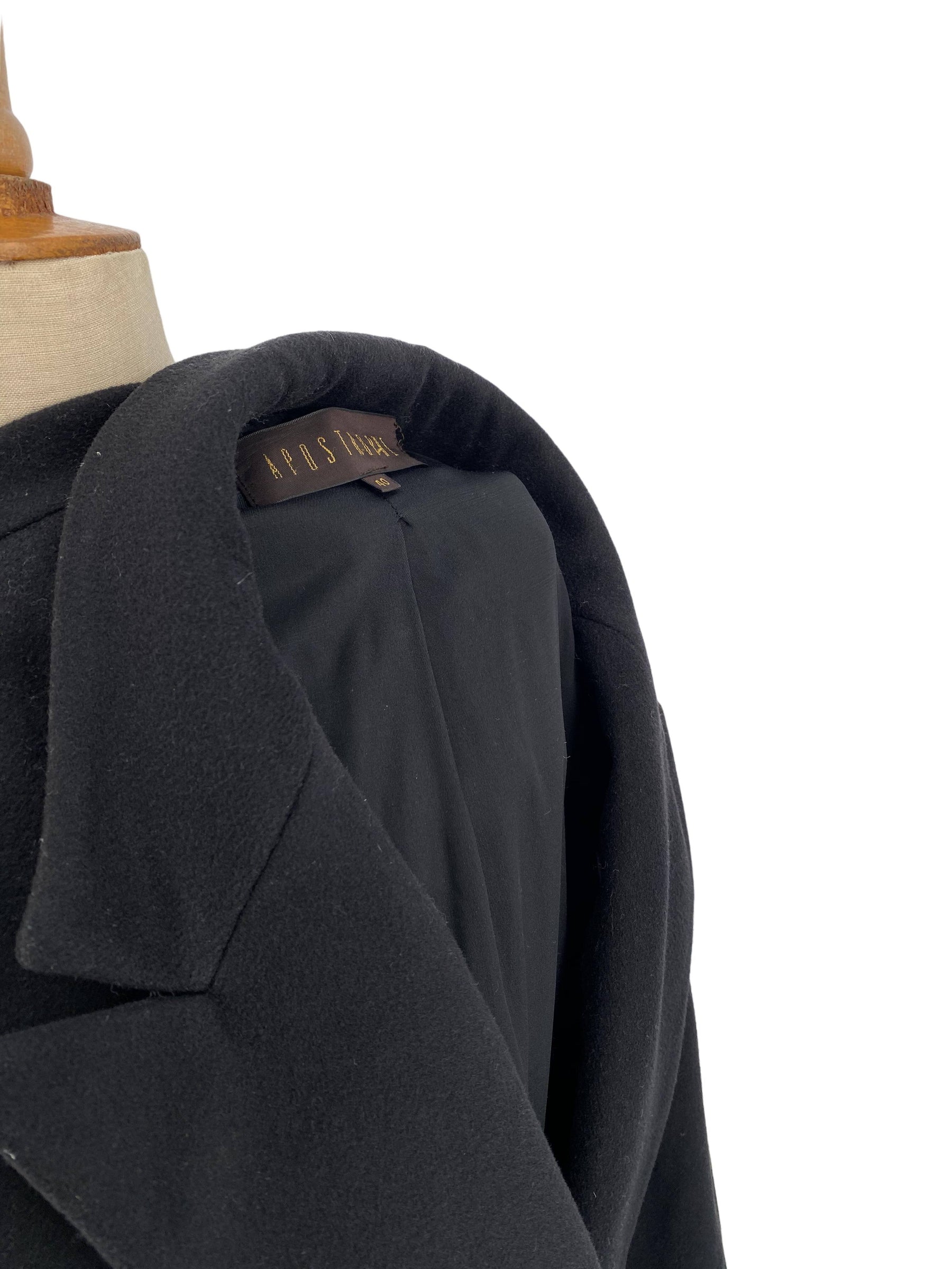 Manteau de seconde main Apostrophe noir 90% laine, 10% cachemire. Taille 40. Longueur : 90cm. Largeur taille : 54cm. Collection Femme. Bon État. Col cranté, fermeture par boutons dissimulés, deux poches à rabat, doublure intégrée. Référence : 1334014.