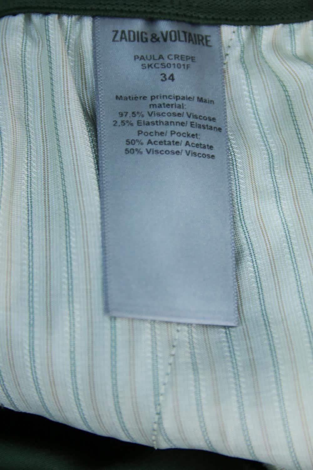 Pantalon élastiqué à la taille - Modèle Paula Crepe - Taille 33cm - Fourche 23cm - Longueur 93cm - collection AH2022 prix boutique 245 euros de seconde main Zadig & Voltaire vert 97.5% viscose 2.5% elasthanne. Taille 41. Collection Femme. Très Bon État. Référence : IP13113.
