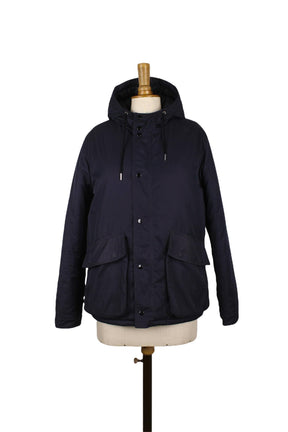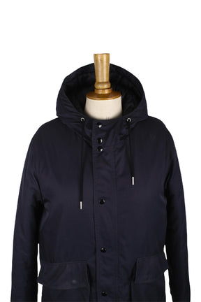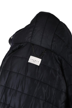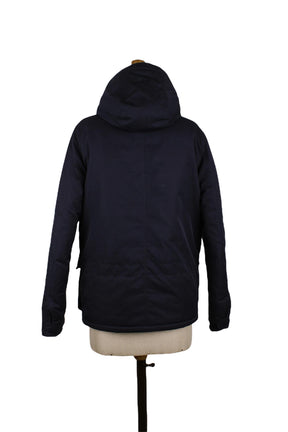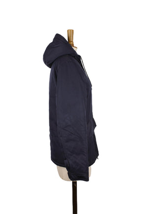 Parka de seconde main Sandro bleu 100% polyester. Taille 34. Longueur : 70cm. Épaules : 50cm. Largeur taille : 50cm. Collection Femme. Bon État. Capuche, matière imperméable, intérieur matelassé, coupe ajustée, modèle Homme, doublure intégrée. Référence : 1195006.